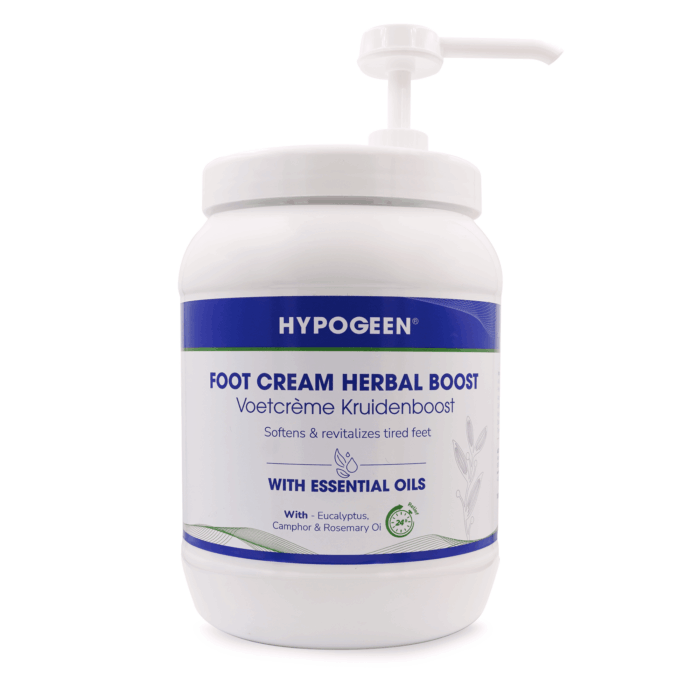 For comprehensive foot care in professional environments, the Hypogeen Foot Cream Herbal Boost in a generous 1500ml pump bottle offers optimal care. This specialist formula, with eucalyptus, lavender, pine, and other active ingredients, improves circulation, soothes, and revitalizes tired feet. The cream softens and warms the skin while reducing the risk of cracks, calluses, and flakiness. Free from paraffin oil, petroleum jelly, fragrance, and colorants, and with a neutral pH for gentle care. This cream absorbs quickly into the skin, providing immediate comfort without leaving a greasy feeling. Lavender soothes and protects the skin, pine stimulates circulation, while eucalyptus has antiseptic properties and provides a refreshing boost.