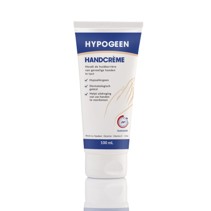 De Hypogeen Handcrème 100ml is speciaal ontwikkeld voor extreem droge en gevoelige handen. Deze hypoallergene handcrème biedt intensieve verzorging en helpt schilferige, droge handen te herstellen. Het product is ideaal voor mensen die last hebben van eczeem of psoriasis, en het bevordert het herstel van de huid, waarbij het de vochtbalans reguleert. De formule is vrij van parfum, kleurstoffen, vaseline en paraffineolie, en bevat melkzuur voor een verbeterde huidstructuur en het behoud van een gezonde pH-waarde.
