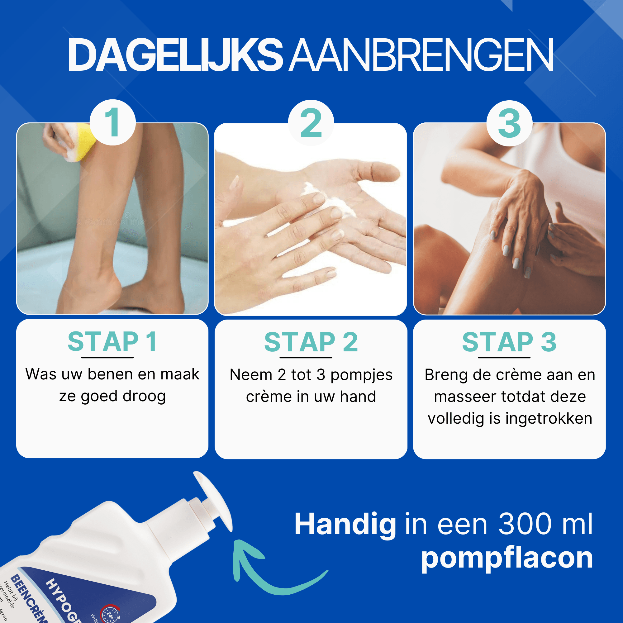 Breng dagelijks een ruime hoeveelheid crème aan op de benen en masseer deze licht in totdat de huid het volledig heeft opgenomen. De snel intrekkende, niet-vette formule maakt de crème ideaal onder steunkousen; je kunt deze kort na het insmeren gewoon weer aantrekken. Bij onrustige aanvallen van de benen, adviseren wij de crème direct aan te brengen.