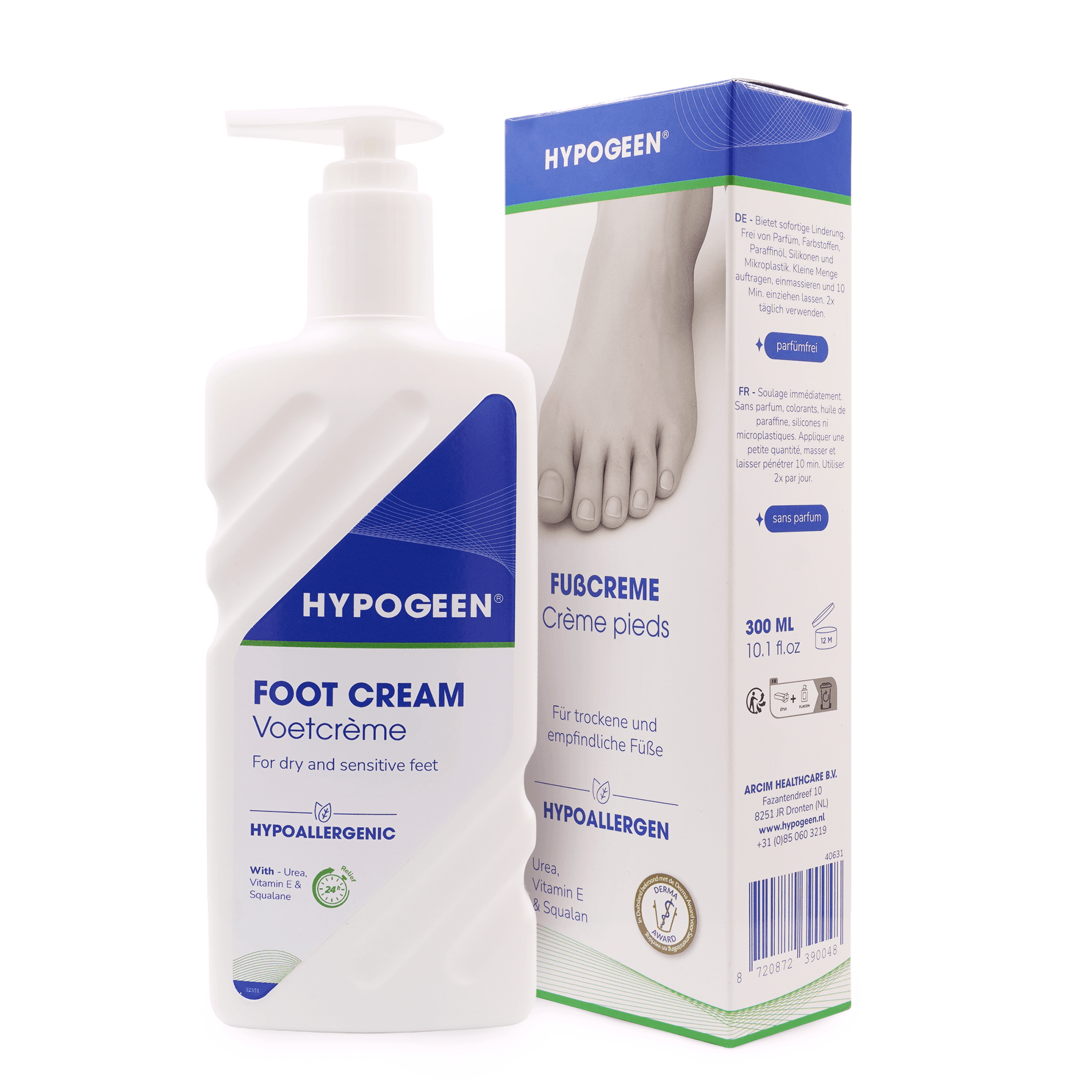 De Hypogeen Voetcrème in de 300ml pompflacon biedt dagelijkse verzorging voor droge voeten, met een rijke formule die squalaan, vitamine E, ureum en calendula-extract combineert. Deze hydraterende voetcrème is speciaal ontwikkeld voor de gevoelige huid en trekt snel in zonder een vet of plakkerig residu. De crème is vrij van vaseline, paraffineolie, parfum en kleurstoffen en heeft een neutrale pH-waarde, wat zorgt voor een milde, effectieve verzorging van je voeten.