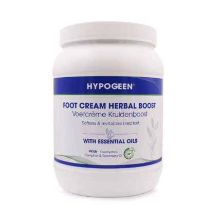 De Hypogeen Voetcrème Kruidenboost in een praktische 300 ml pompflacon biedt intensieve verzorging voor extreem droge en koude voeten. Deze voetcrème, verrijkt met een mix van etherische oliën zoals eucalyptus, lavendel en dennen, verbetert de bloedsomloop en verfrist uw voeten. Het helpt vermoeidheid te verminderen en de huid soepel en warm te houden. De formule sluit de huid niet af dankzij de afwezigheid van paraffine olie en vaseline, wat bijdraagt aan een natuurlijke huidfunctie. Deze crème trekt snel in de huid voor onmiddellijke verlichting en biedt een kalmerende werking door lavendel, verbeterde doorbloeding door dennen, en verkwikking door eucalyptus.